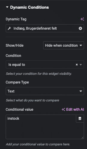For at starte skal du vælge det element du gerne vil bruge, herefter vælger du: Avanceret > Dynamic Conditions, her vælger du det Dynamic Tag som hedder “Indlæg, Brugerdefineret felt” du trykker igen på “Indlæg, Brugerdefineret felt” her skriver “_stock_status” i feltet: Numerisk Tast, herefter skal du bruge indstillingerne som ses på billedet.